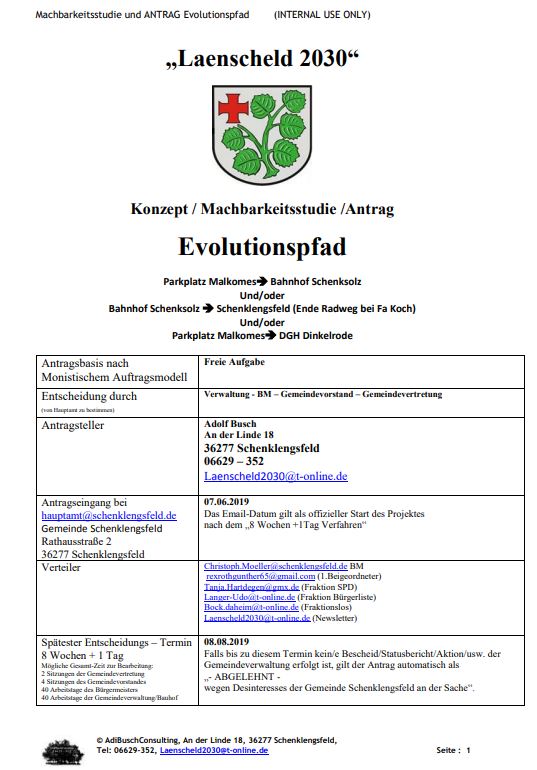 Die Errichtung eines "Evolutionsweges" war eine Idee, die Adi Busch in 2018 als neue Attraktion für Schenklengsfeld ausgearbeitet und vorgeschlagen hatte. Vorstand und GV waren sich prinzipiell einig darüber, dass es eine gute Idee sei. Die Idee ist dann auf dem "Verwaltungsweg" ganz elegant ausgebremst wurden.