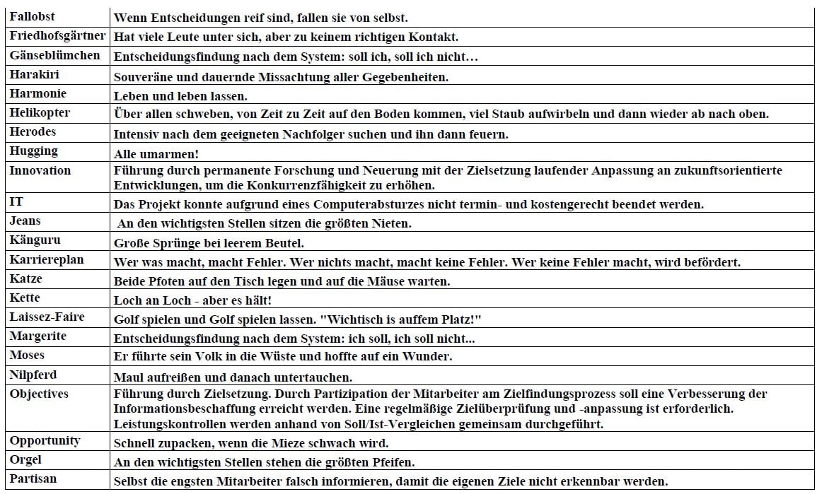 Im Laufe der Zeit habe ich mir eine kleine Liste von Beschreibungen angelegt, die in verschiedenen meiner Projekte das Kernproblem sichtbar gemacht haben. Dazu habe ich gängige Lehrbegriffe aus dem Management-Training (Management by…) je nach Projektsituation erweitert und im Team diskutiert.