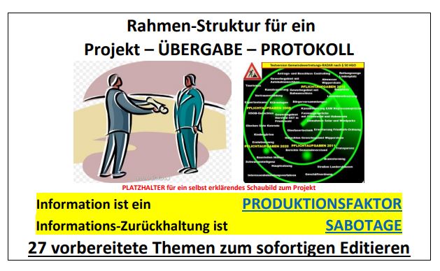 FORMULAR : PROFESSIONELLE PROJEKT-ÜBERGABE Die Amtsübergabe 2018 hat gezeigt, dass eine suboptimale Amtsübergabe die Arbeit der Gemeinde um mindestens ein Jahr extrem behindert. - Nur eine STRUKTURIERTE DOKUMENTATION schafft die Grundlage dafür, dass dem NEUEN PROJEKTLEITER/BÜRGERMEISTER OPTIMALE START-BEDINGUNGEN geliefert werden. - Dieses nach Regeln des PROJEKT-MANAGEMENTS erstellte Struktur wurde seit 2019 permanent weiterentwickelt und den Fraktionen der Gemeindevertretung vorgestellt. Bei Einsatz diese TRANSPARENTEN METHODE zur Projektbeschreibung werden mögliche Schwachstellen FRÜHZEITIG erkannt. Im LOGISCHEN UMKEHRSCHLUSS kann man sagen: Diejenigen PolitikerInnen, die eine solche TRANSPARETE METHODE NICHT NUTZEN, betreiben AKTIV SABOTAGE an §50 HGO (Aufsichtspflicht der GV über den Vorstand). "Planung ersetzt den ZUFALL durch den IRRTUM" (Einstein) | |