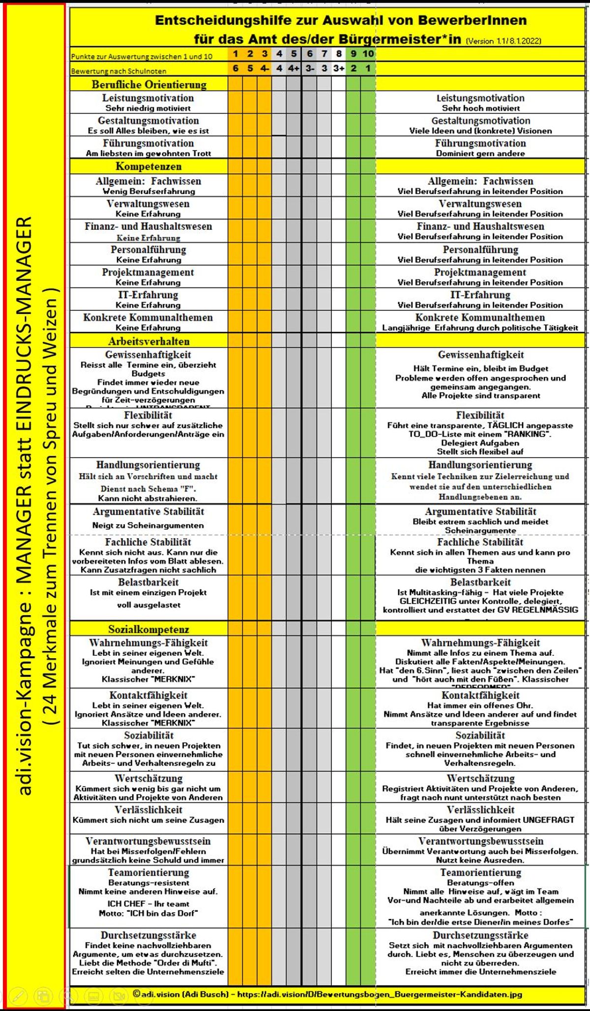 MANAGER - BEWERTUNGS - BOGEN Die WählerInnen haben, je nach Bereich, nur alle 4, 5, oder 6 Jahre die Gelegenheit, "per Kreuzchen" ihre Wahl kund zu tun. Bei der Bürgermeister-Wahl 2023 in "36277 Schenklengsfeld" haben die WählerInnen ein eindeutiges Ergebnis erzielt. Übertragen auf die Kriterien des "Manager-Bewertungs-Bogens" sähe das Ergebnis so aus, wie HI https://adi.vision/D/Auswahl%20Buergermeister%2070_30.JPG ER beschrieben.